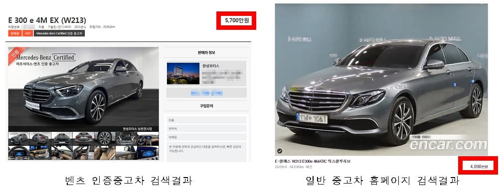 시세를 확인해 보셨는지요? 아래 사진처럼 Benz E클래스 인증중고차 가격은 신차대비 거의 반값 수준입니다. 물론 차를 구매하실 때의 내차 사기가 아닌 내차 팔기의 경우에는 시세가 다르니 주의하셔야 합니다.