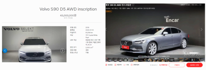 지금까지 제가 말씀드린 부분들이 모두 좋은 점만 있어서 약간의 의구심도 들 수 있을 것입니다. 물론 인증된 차량을 사실 때 단점도 존재합니다. 그것은 바로 일반 매매상에 비해 약간 비싸다는 것입니다. 하지만 고장 시 수리비 위험부담이 큰 수입 중고차 세계에서 처음에 좀 더 비용을 지불하고 제대로 된 차량을 구매하시는 게 돈을 버는 것일 수 있습니다. 아래에 예시를 보시면 볼보 홈페이지에서 파는 인증된 차량이 일반 매매상에서 파는 차량보다 10% 정도 가격이 높았습니다.