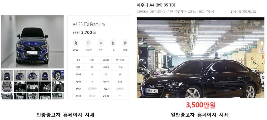그리고 인증된 중고차라 할지라도 단점이 분명 있습니다. 단점은 바로 우리가 흔히 보는 중고 자동차 사이트보다 좀 더 비싸다는 점이지요. 얼마나 비싸냐고요? 아래 사진을 보시면 2021년식 아우디 A4 모델 비슷한 운행거리 차량가격을 비교한 결과 인증 중고차 플랫폼 시세가 약 10% 내외 정도 가격이 높았습니다. 개인적인 의견으로는 품질과 사후관리를 보장한다면 이 정도 금액 차이는 충분히 지불할 가치가 있다고 생각합니다.