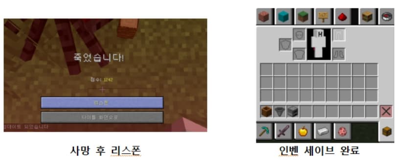 여기서 짜증 나는 점은 지니고 있던 모든 아이템을 떨구게 된다는 점입니다. 애써 모은 괜찮은 곡괭이와 갑옷 등이 허망하게 모두 사라집니다. 이때 플레이 도중 죽게 되어도 가지고 있던 아이템을 그대로 보유하고 있는 상태에서 리스폰하는 행위가 마로 <인벤 세이브 명령어>입니다. 마크 세이브 명령어는 사실상 마인크래프트를 즐겁게 즐기기 위한 필수 치트키입니다.