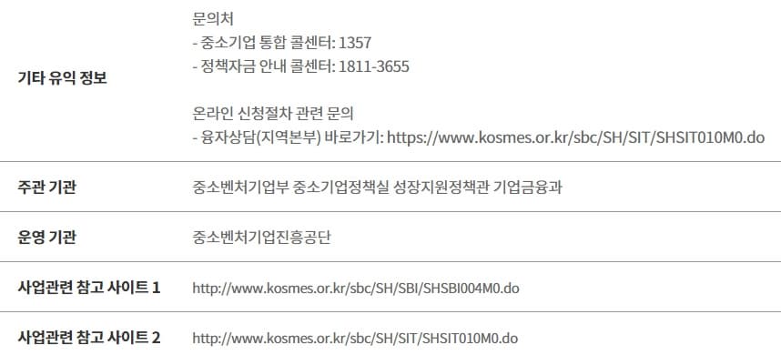 - 지원대상: 「중소기업창업 지원법」 제2조에 따른 창업자(업력 7년 미만, 예비창업자 포함)이며, 동법 제25조에 따른 신산업 창업 분야의 중소기업은 사업 개시일로부터 10년 이내인 기업