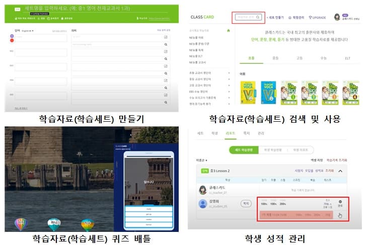 - <학습세트>를 학생들에게 게임형식으로 제공하는 <클래스 카드 퀴즈 배틀>을 운영할 수 있습니다.